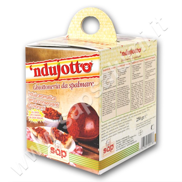 'Ndujotto® è la variante dolce della 'Nduja di Spilinga, salame spalmabile tipico, lavorato in questo caso in modo più fine e macinato con peperoncino rosso dolce invece che piccante.